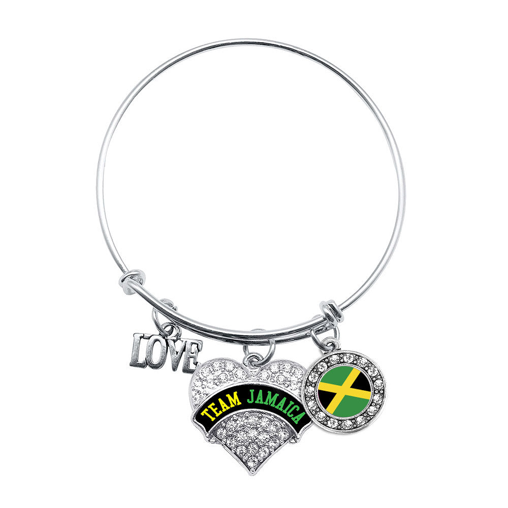 Our sparkling wire bangle bracelet, equipped with the Team Jamaica pave heart charm, is crafted from white metal with a silver plated finish and accented with cubic zirconia stones.