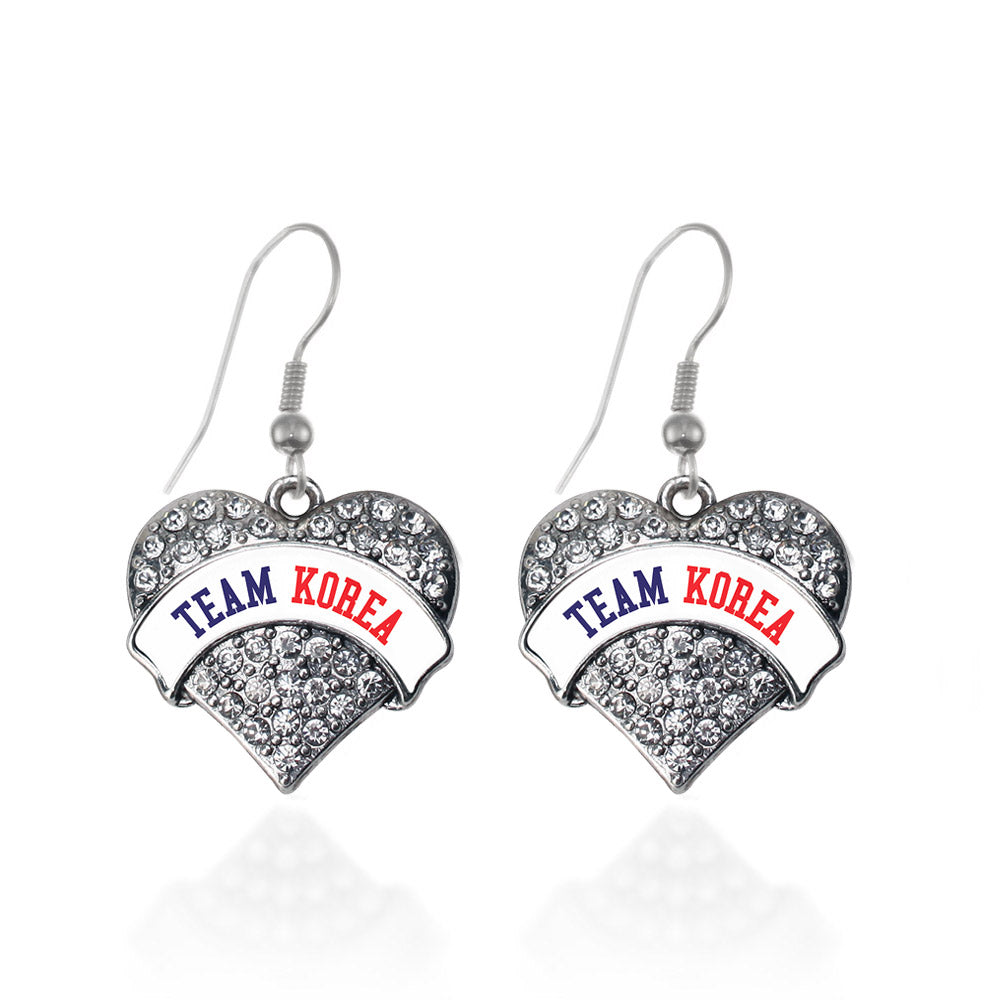 Our sparkling dangle earrings, equipped with a stylish french hook backing and the Team Korea pave heart charm, is crafted from white metal with a silver plated finish and accented with cubic zirconia stones.