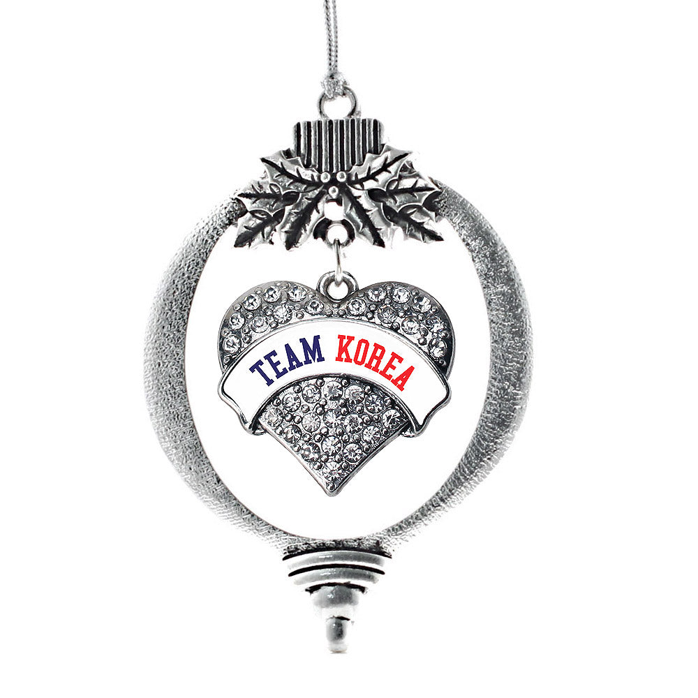 Our sparkling holiday ornament, equipped with a stylish silver rope and the Team Korea pave heart charm, is crafted from white metal with a silver plated finish and accented with cubic zirconia stones.