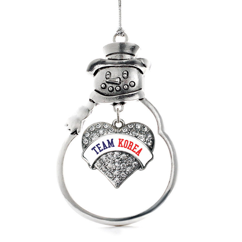 Our sparkling snowman ornament, equipped with a stylish silver rope and the Team Korea pave heart charm, is crafted from white metal with a silver plated finish and accented with cubic zirconia stones.