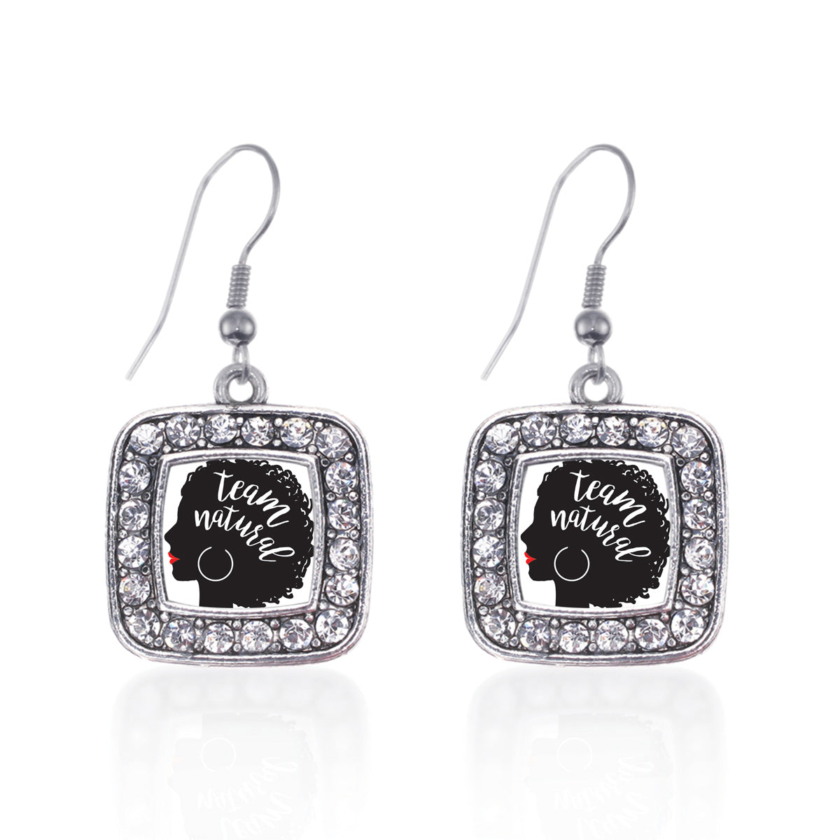 Our sparkling dangle earrings, equipped with a stylish french hook backing and the Team Natural - Naturally Beautiful Hair square charm, is crafted from white metal with a silver plated finish and accented with cubic zirconia stones.