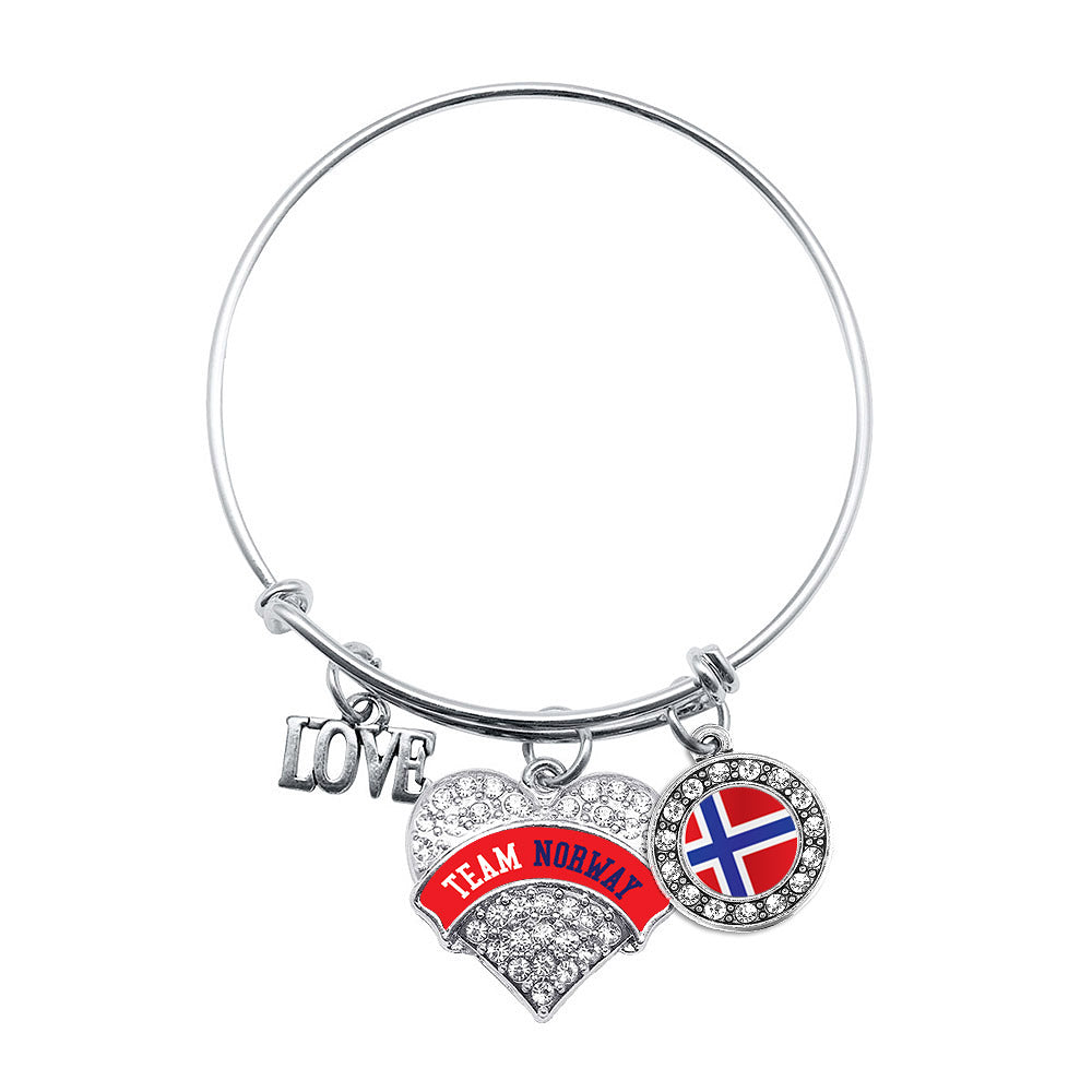 Our sparkling wire bangle bracelet, equipped with the Team Norway pave heart charm, is crafted from white metal with a silver plated finish and accented with cubic zirconia stones.