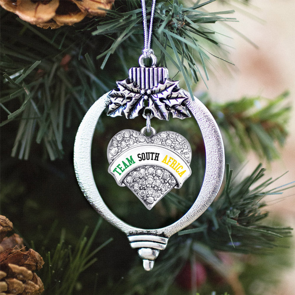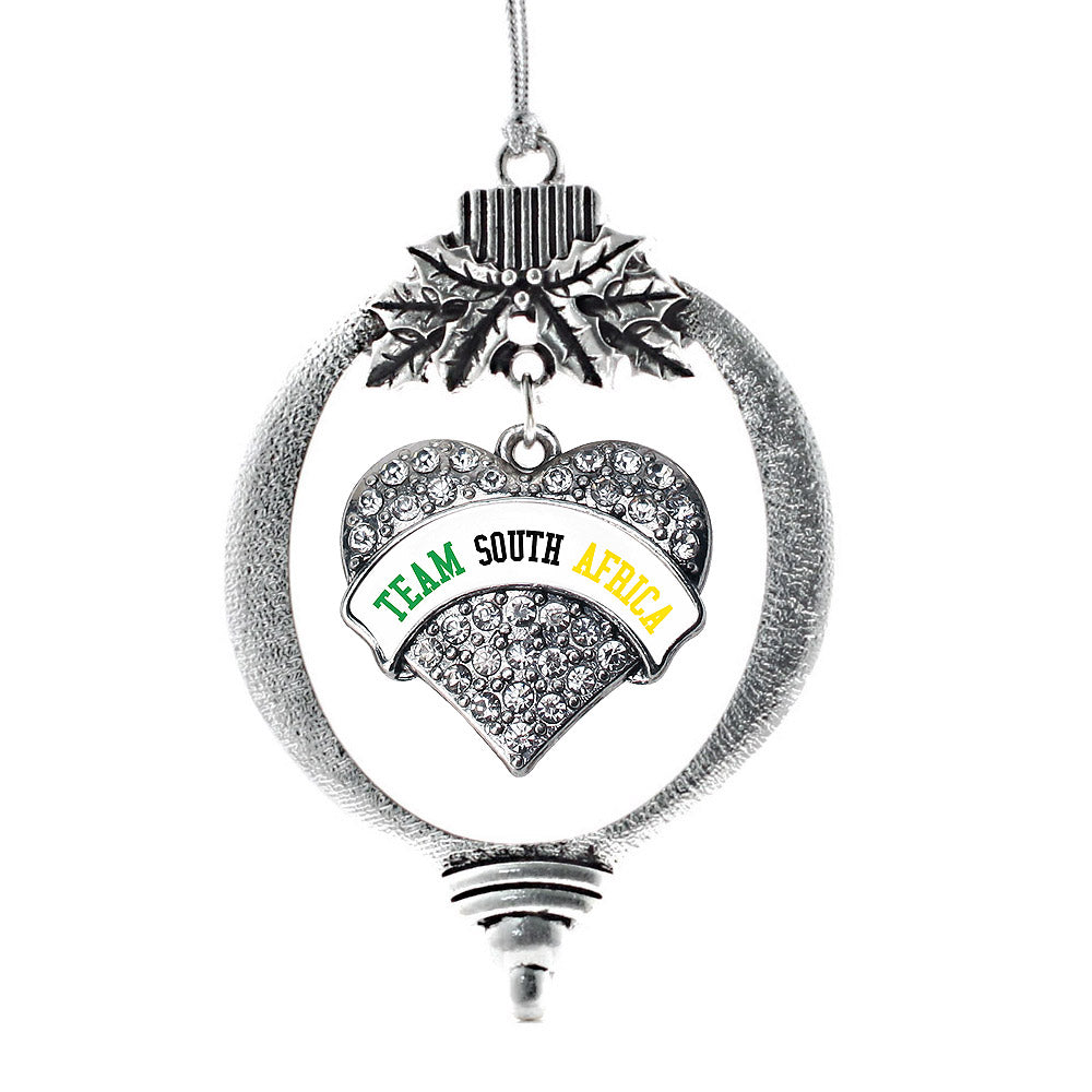Our sparkling holiday ornament, equipped with a stylish silver rope and the Team South Africa pave heart charm, is crafted from white metal with a silver plated finish and accented with cubic zirconia stones.
