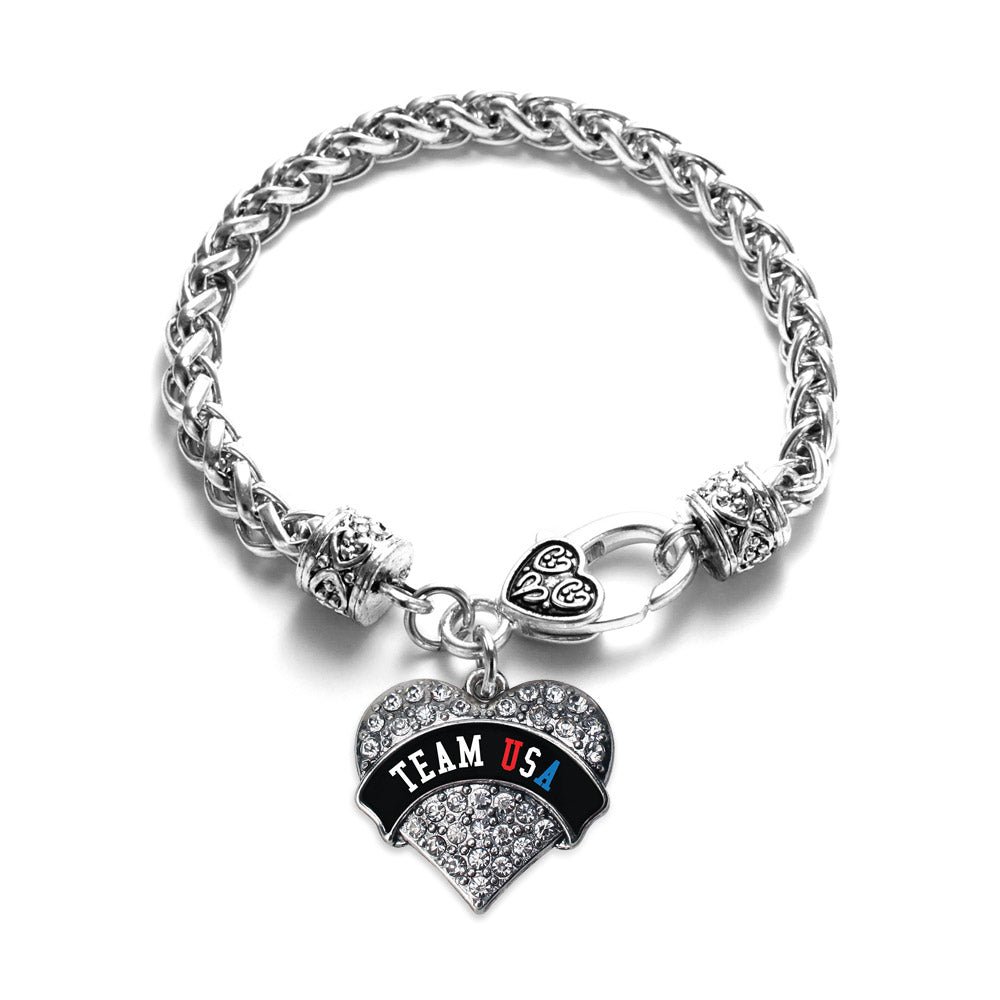 Our sparkling braided bracelet, equipped with a stylish lobster claw clasp and the Team USA - Black Banner pave heart charm, is crafted from white metal with a silver plated finish and accented with cubic zirconia stones.