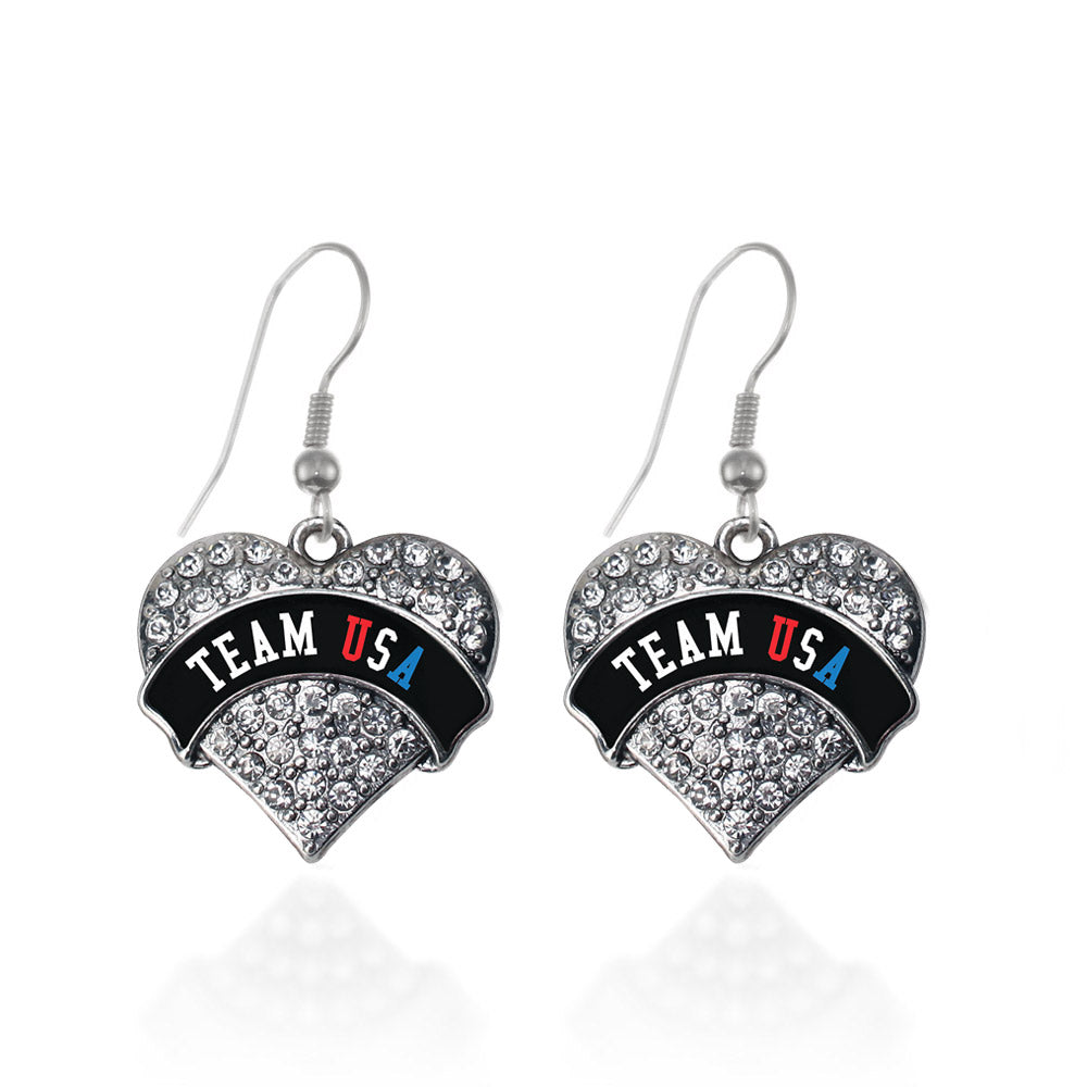 Our sparkling dangle earrings, equipped with a stylish french hook backing and the Team USA - Black Banner pave heart charm, is crafted from white metal with a silver plated finish and accented with cubic zirconia stones.