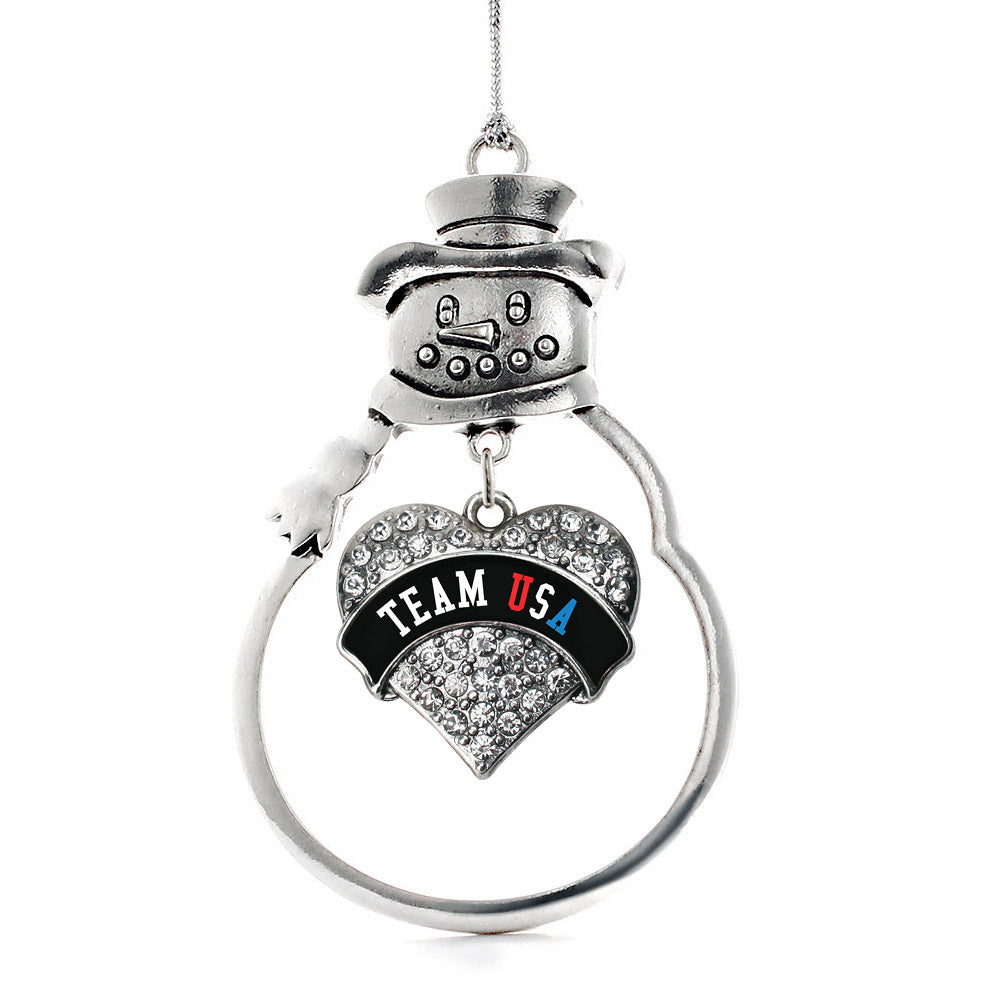 Our sparkling snowman ornament, equipped with a stylish silver rope and the Team USA - Black Banner pave heart charm, is crafted from white metal with a silver plated finish and accented with cubic zirconia stones.