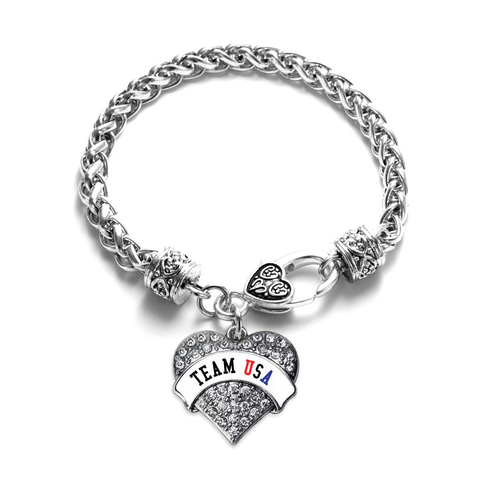 Our sparkling braided bracelet, equipped with a stylish lobster claw clasp and the Team USA - White Banner pave heart charm, is crafted from white metal with a silver plated finish and accented with cubic zirconia stones.