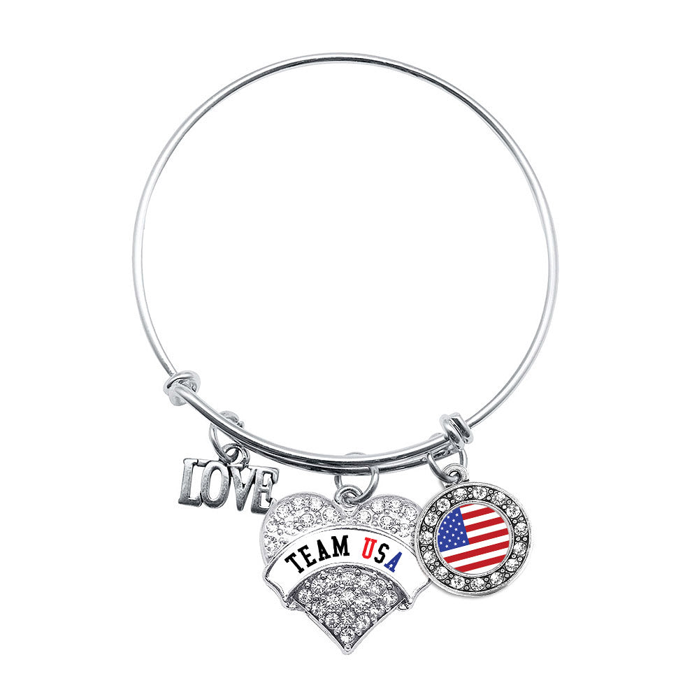 Our sparkling wire bangle bracelet, equipped with the Team USA - White Banner pave heart charm, is crafted from white metal with a silver plated finish and accented with cubic zirconia stones.