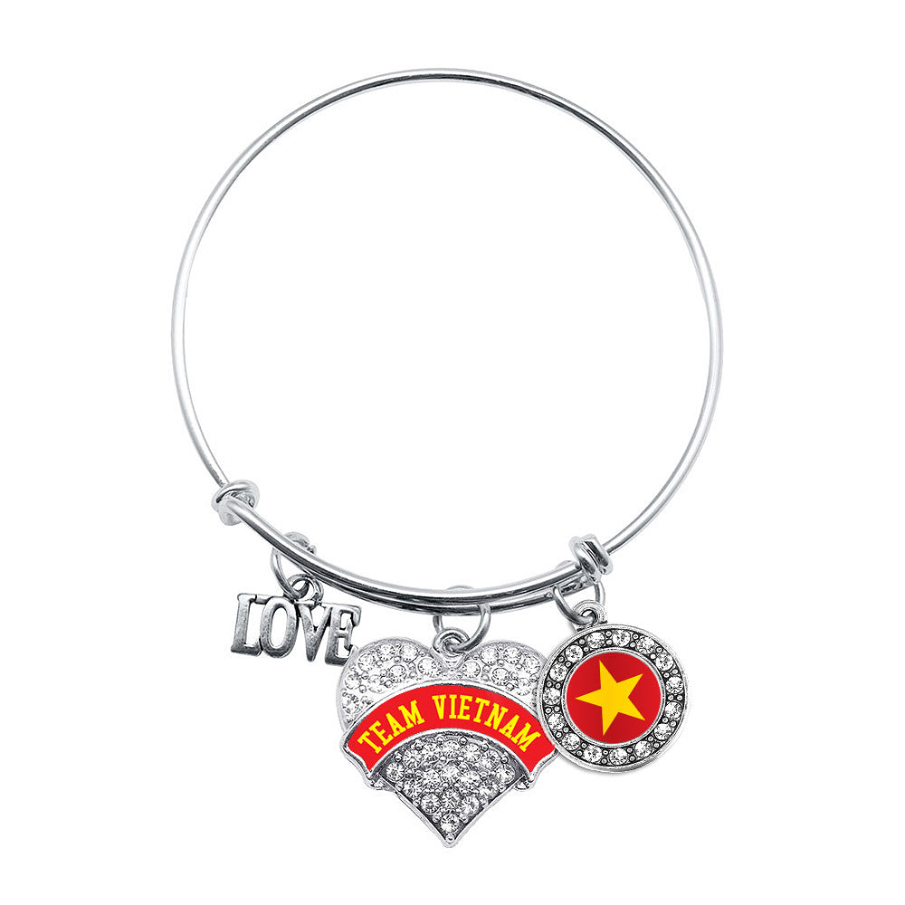 Our sparkling wire bangle bracelet, equipped with the Team Vietnam pave heart charm, is crafted from white metal with a silver plated finish and accented with cubic zirconia stones.