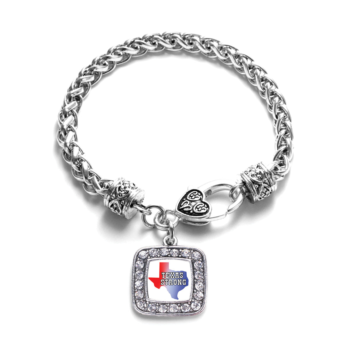 Our sparkling braided bracelet, equipped with a stylish lobster claw clasp and the Texas Strong - State Silhouette square charm, is crafted from white metal with a silver plated finish and accented with cubic zirconia stones.