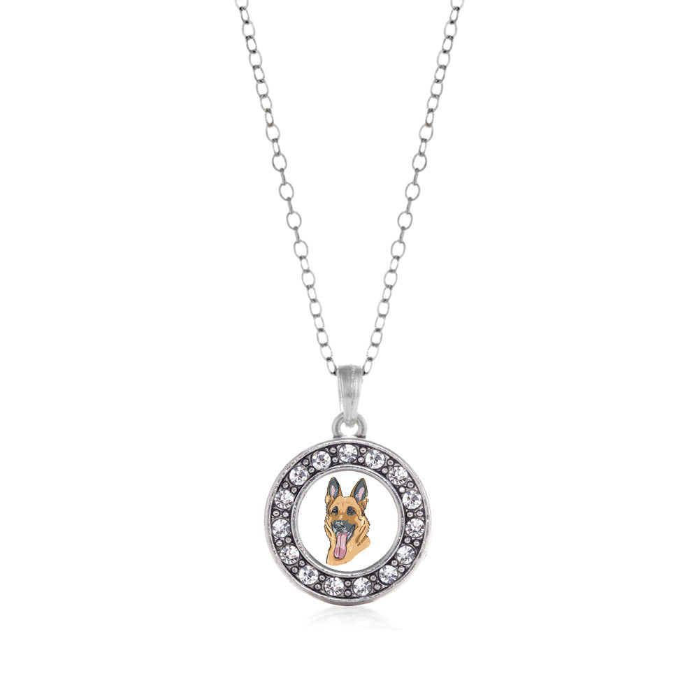 Our sparkling classic necklace, equipped with a stylish lobster claw clasp and the The German Shepherd circle charm, is crafted from white metal with a silver plated finish and accented with cubic zirconia stones.