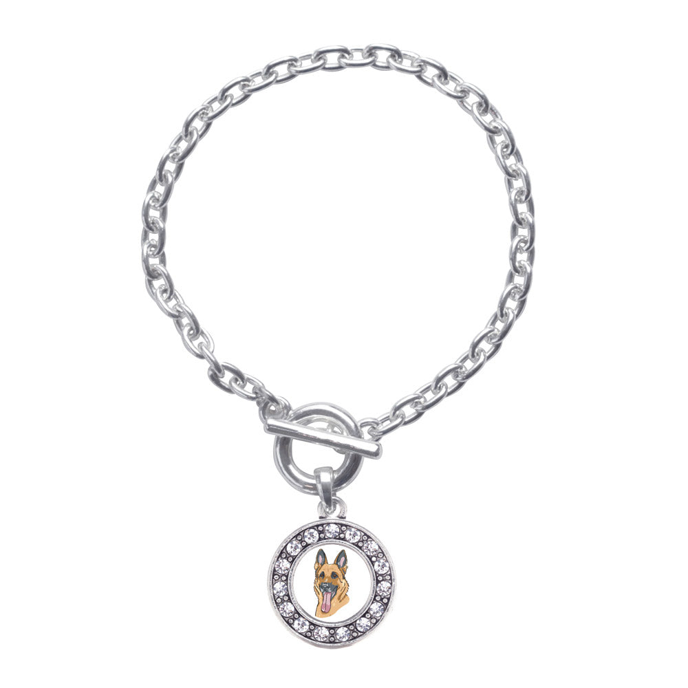 Our sparkling toggle bracelet, equipped with a stylish toggle clasp and the The German Shepherd circle charm, is crafted from white metal with a silver plated finish and accented with cubic zirconia stones.
