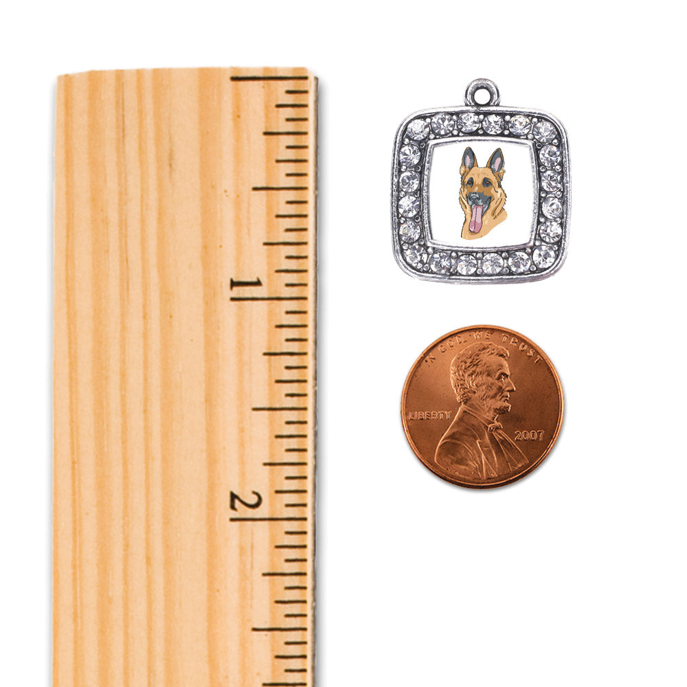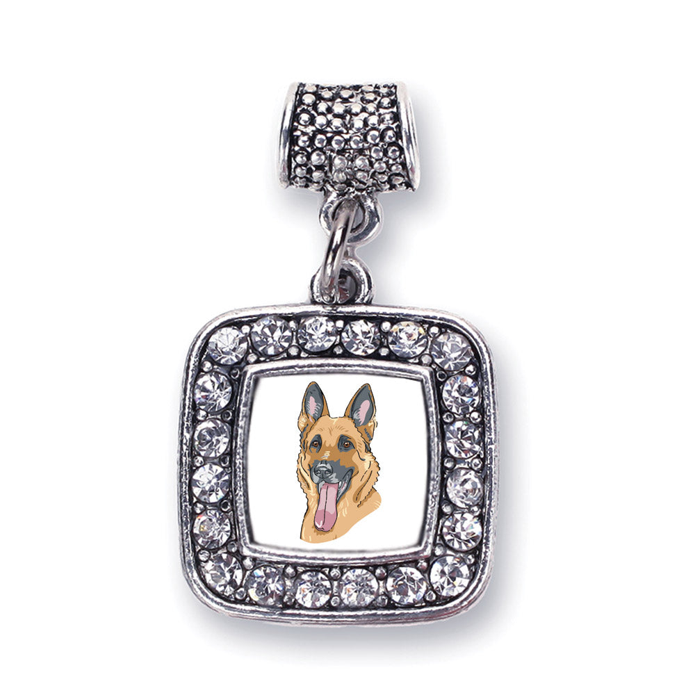 Our sparkling memory charm, equipped with a stylish charm attachment ring and the The German Shepherd square charm, is crafted from white metal with a silver plated finish and accented with cubic zirconia stones.