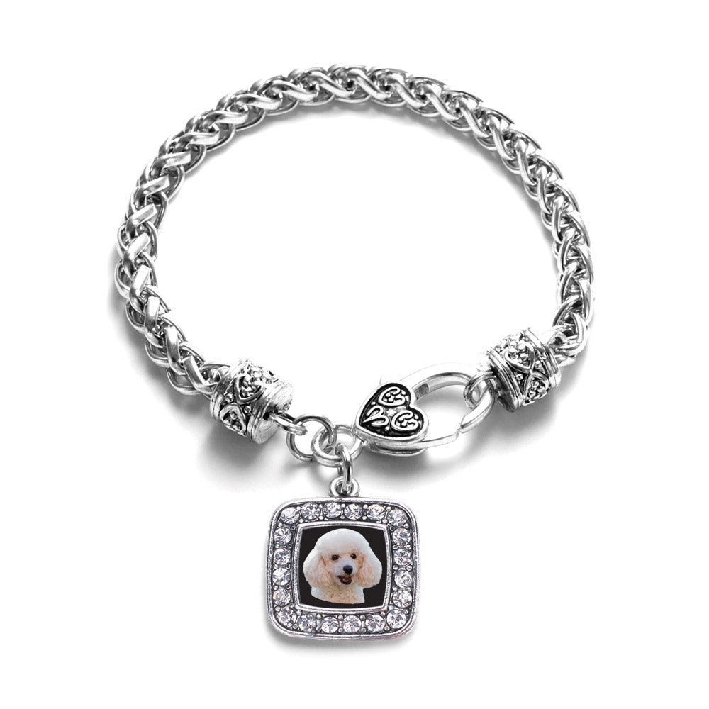 Our sparkling braided bracelet, equipped with a stylish lobster claw clasp and the The Poodle square charm, is crafted from white metal with a silver plated finish and accented with cubic zirconia stones.
