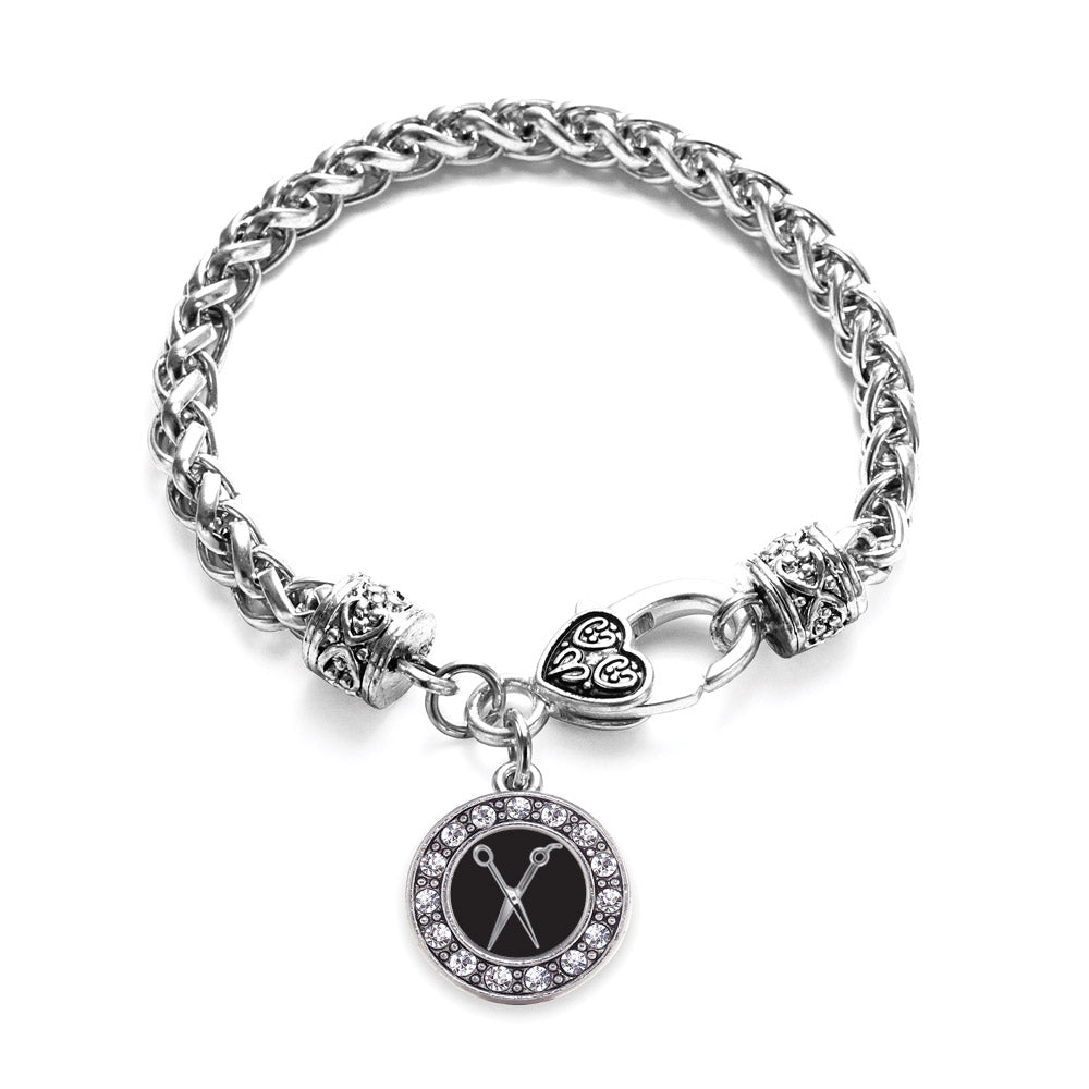Our sparkling braided bracelet, equipped with a stylish lobster claw clasp and the The Stylist circle charm, is crafted from white metal with a silver plated finish and accented with cubic zirconia stones.
