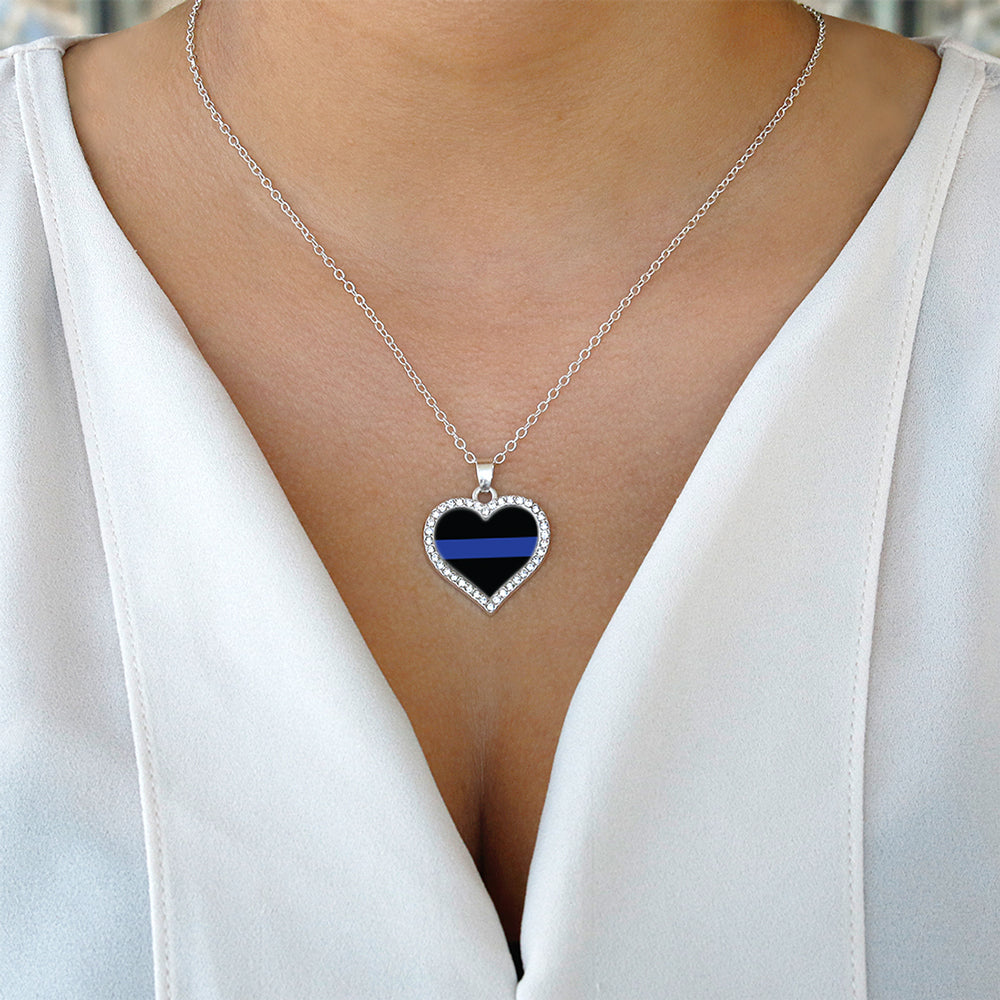 Our sparkling classic necklace, equipped with a stylish lobster claw clasp and the Thin Blue Line - Police Support open heart charm, is crafted from white metal with a silver plated finish and accented with cubic zirconia stones.
