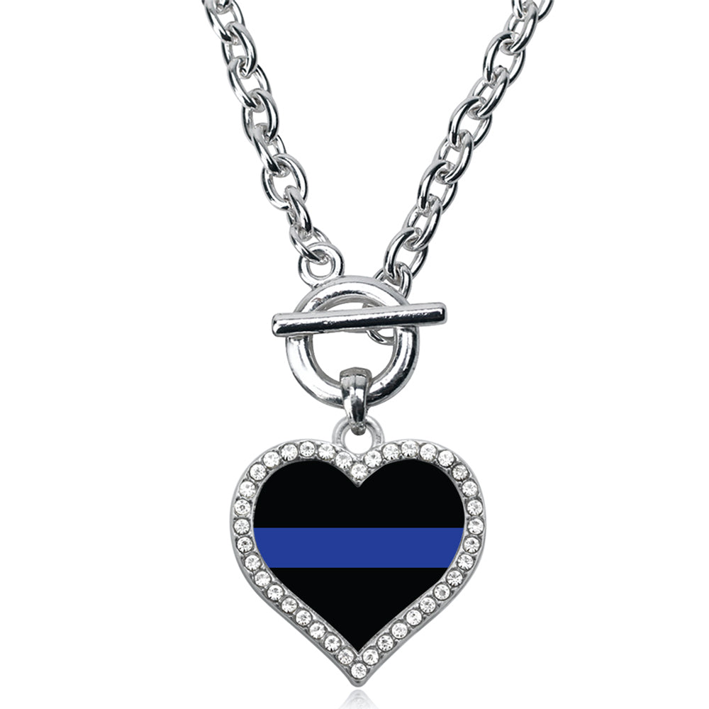 Our sparkling toggle necklace, equipped with a stylish toggle clasp and the Thin Blue Line - Police Support open heart charm, is crafted from white metal with a silver plated finish and accented with cubic zirconia stones.