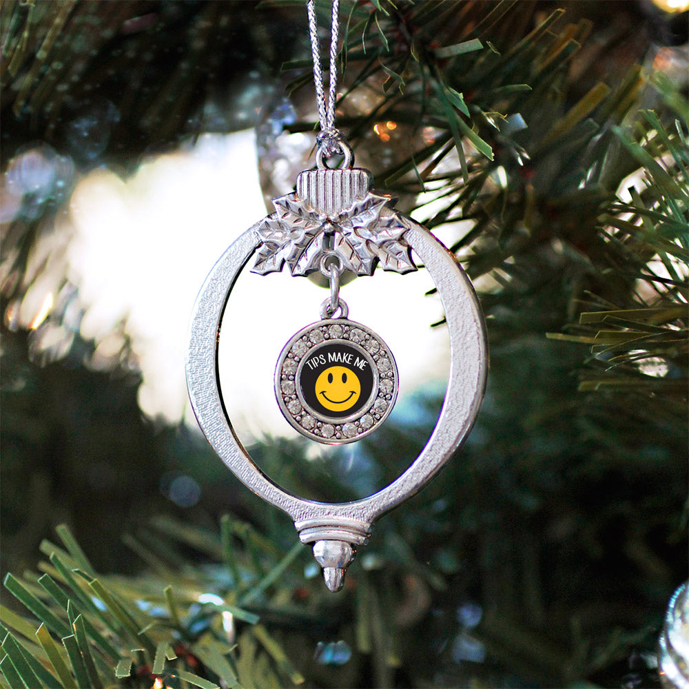 Our sparkling holiday ornament, equipped with a stylish silver rope and the Tips Make Me Smile circle charm, is crafted from white metal with a silver plated finish and accented with cubic zirconia stones.