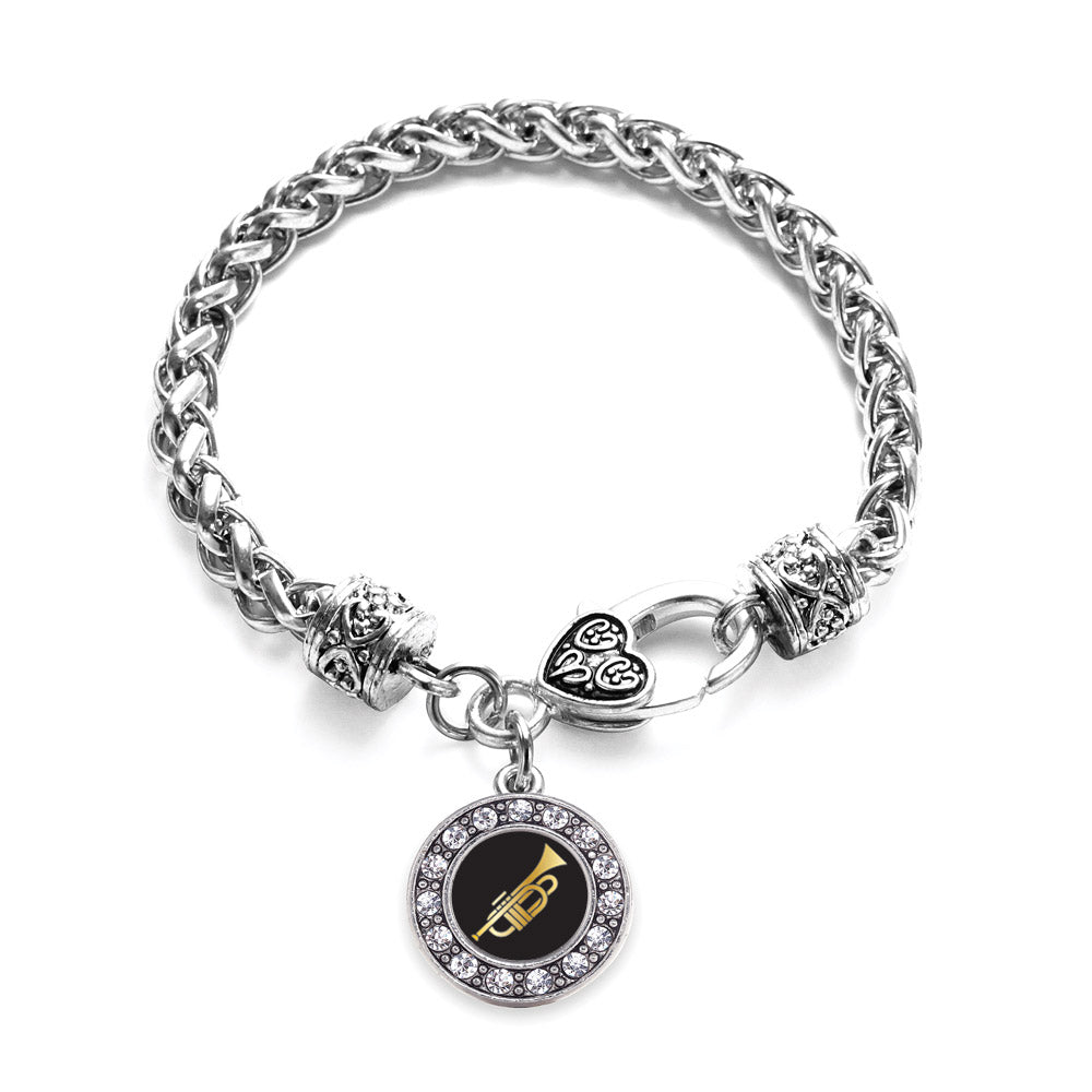 Our sparkling braided bracelet, equipped with a stylish lobster claw clasp and the Trumpet circle charm, is crafted from white metal with a silver plated finish and accented with cubic zirconia stones.