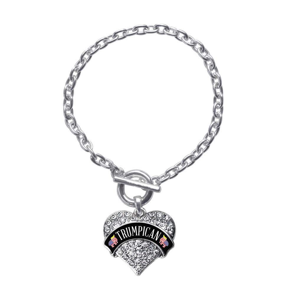 Our sparkling toggle bracelet, equipped with a stylish toggle clasp and the Trumpican pave heart charm, is crafted from white metal with a silver plated finish and accented with cubic zirconia stones.