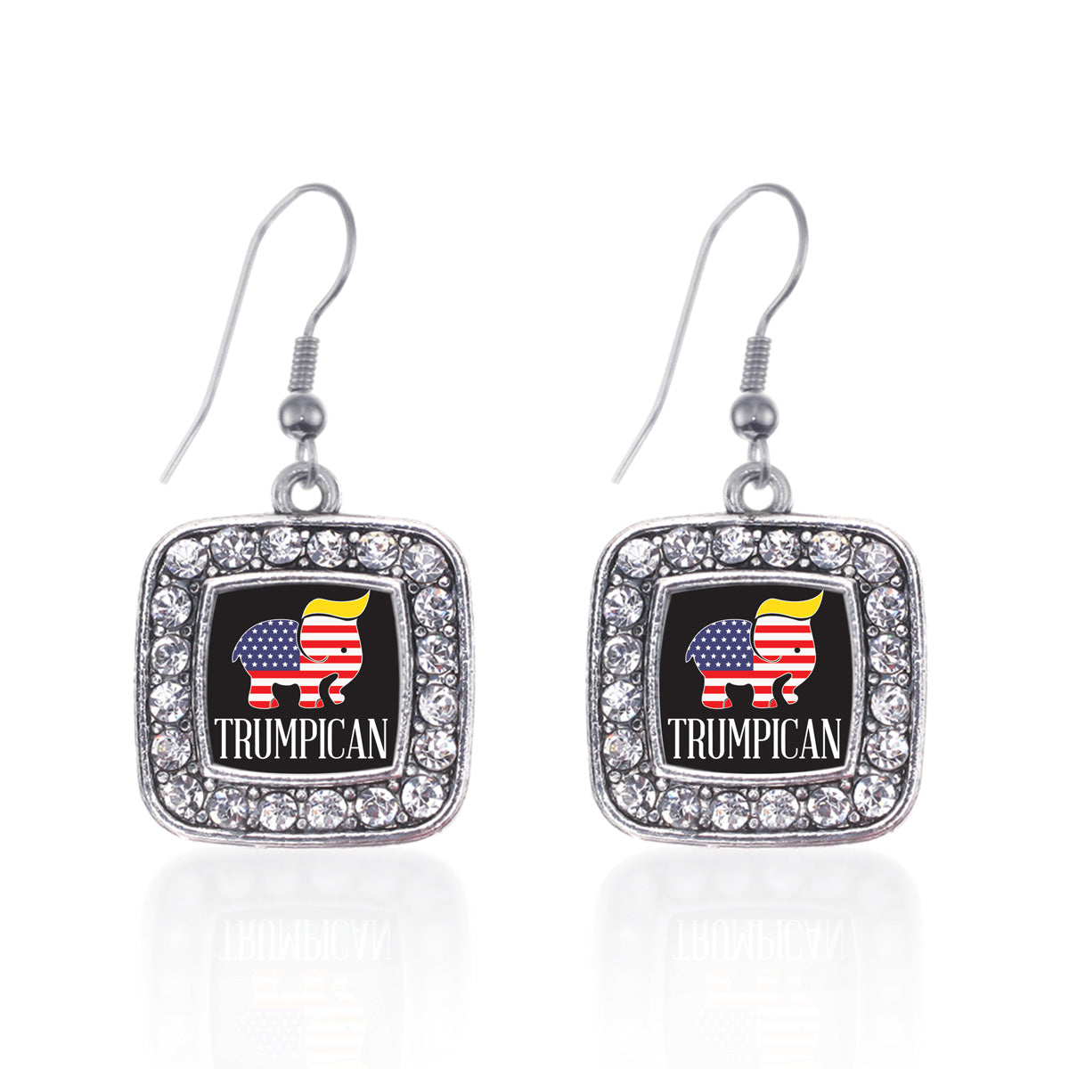 Our sparkling dangle earrings, equipped with a stylish french hook backing and the Trumpican square charm, is crafted from white metal with a silver plated finish and accented with cubic zirconia stones.