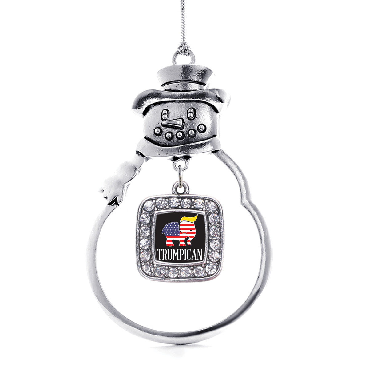 Our sparkling snowman ornament, equipped with a stylish silver rope and the Trumpican square charm, is crafted from white metal with a silver plated finish and accented with cubic zirconia stones.