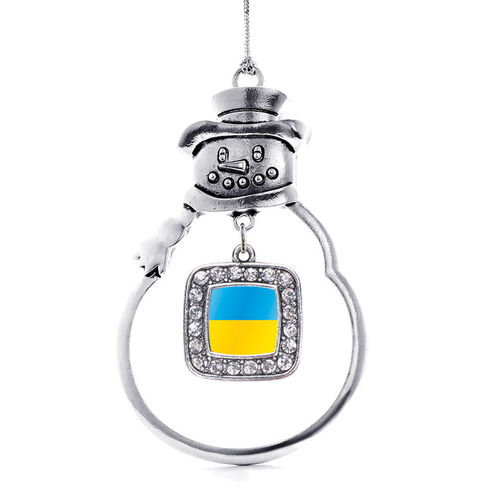 Our sparkling snowman ornament, equipped with a stylish silver rope and the Ukraine Flag square charm, is crafted from white metal with a silver plated finish and accented with cubic zirconia stones.