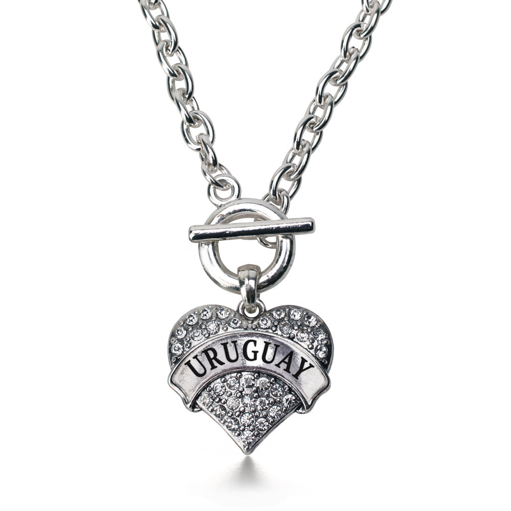 Our sparkling toggle necklace, equipped with a stylish toggle clasp and the Uruguay pave heart charm, is crafted from white metal with a silver plated finish and accented with cubic zirconia stones.