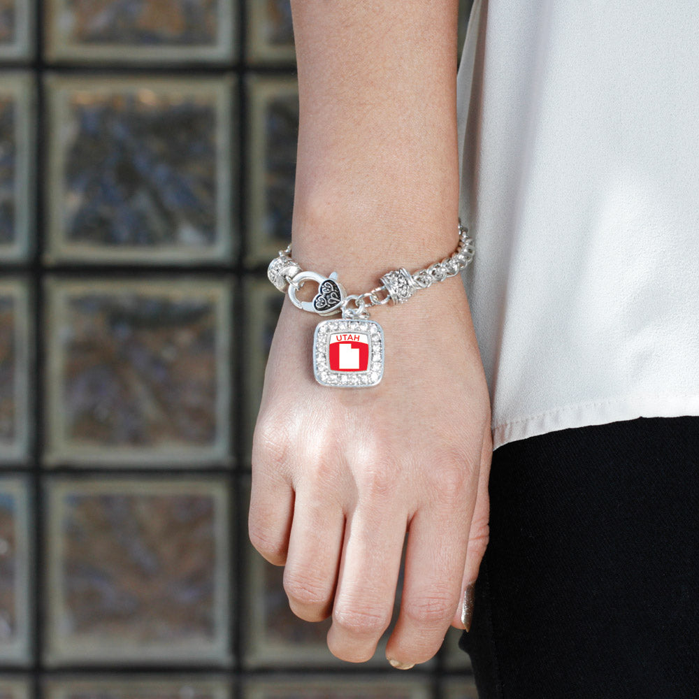 Our sparkling braided bracelet, equipped with a stylish lobster claw clasp and the Utah Outline square charm, is crafted from white metal with a silver plated finish and accented with cubic zirconia stones.
