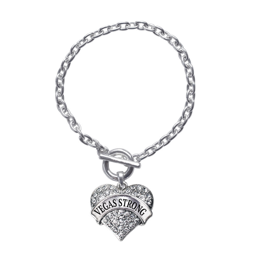 Our sparkling toggle bracelet, equipped with a stylish toggle clasp and the Vegas Strong pave heart charm, is crafted from white metal with a silver plated finish and accented with cubic zirconia stones.
