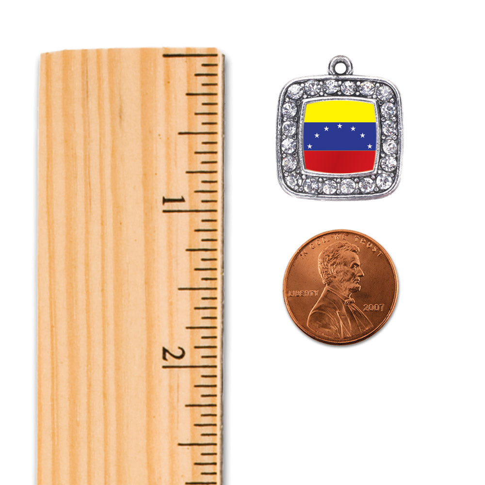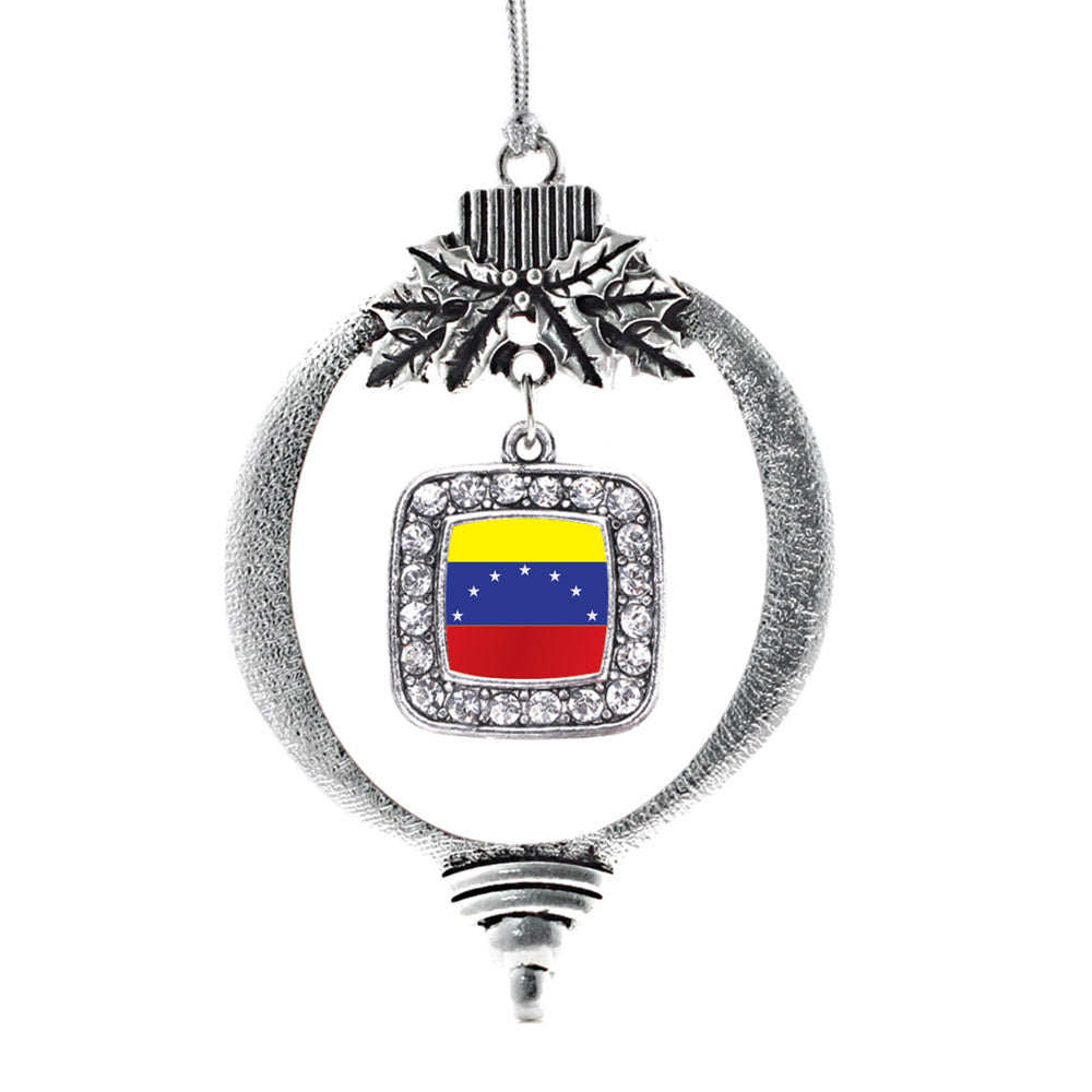 Our sparkling holiday ornament, equipped with a stylish silver rope and the Venezuela Flag square charm, is crafted from white metal with a silver plated finish and accented with cubic zirconia stones.