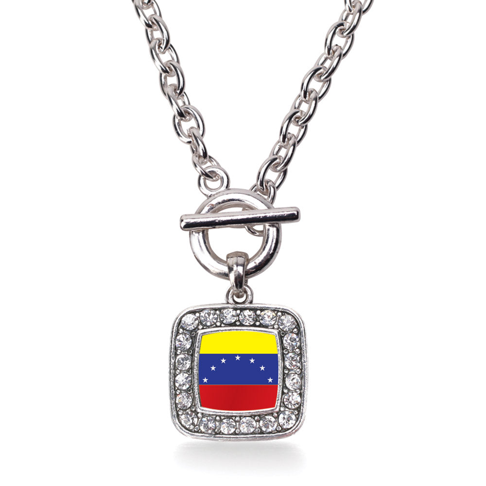 Our sparkling toggle necklace, equipped with a stylish toggle clasp and the Venezuela Flag square charm, is crafted from white metal with a silver plated finish and accented with cubic zirconia stones.