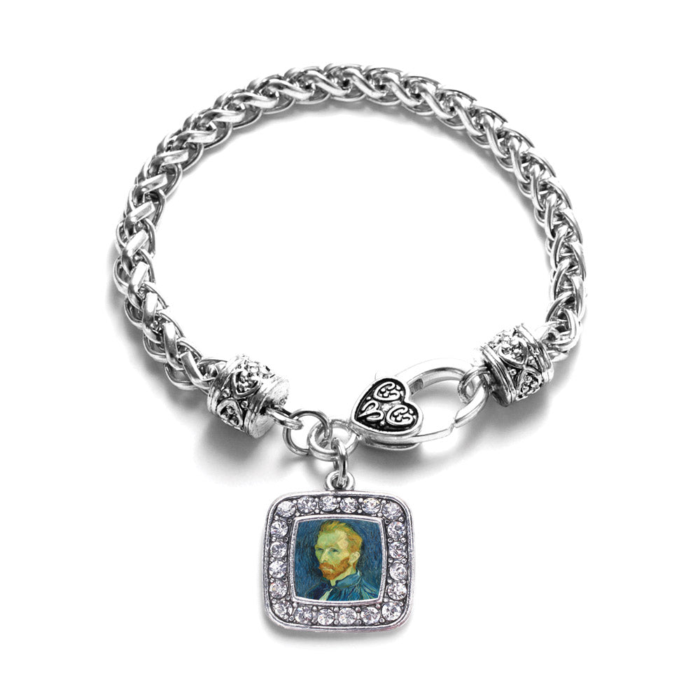 Our sparkling braided bracelet, equipped with a stylish lobster claw clasp and the Vincent Van Gogh square charm, is crafted from white metal with a silver plated finish and accented with cubic zirconia stones.