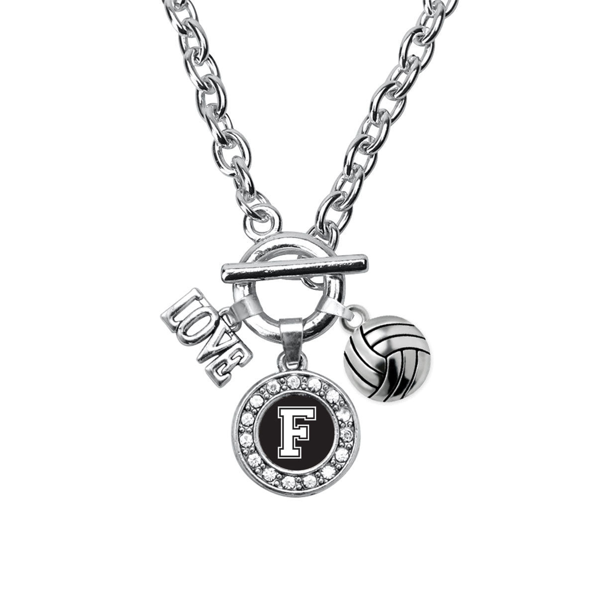 Our sparkling toggle necklace, equipped with a stylish toggle clasp and the Volleyball - Sports Initial F circle charm, is crafted from white metal with a silver plated finish and accented with cubic zirconia stones.
