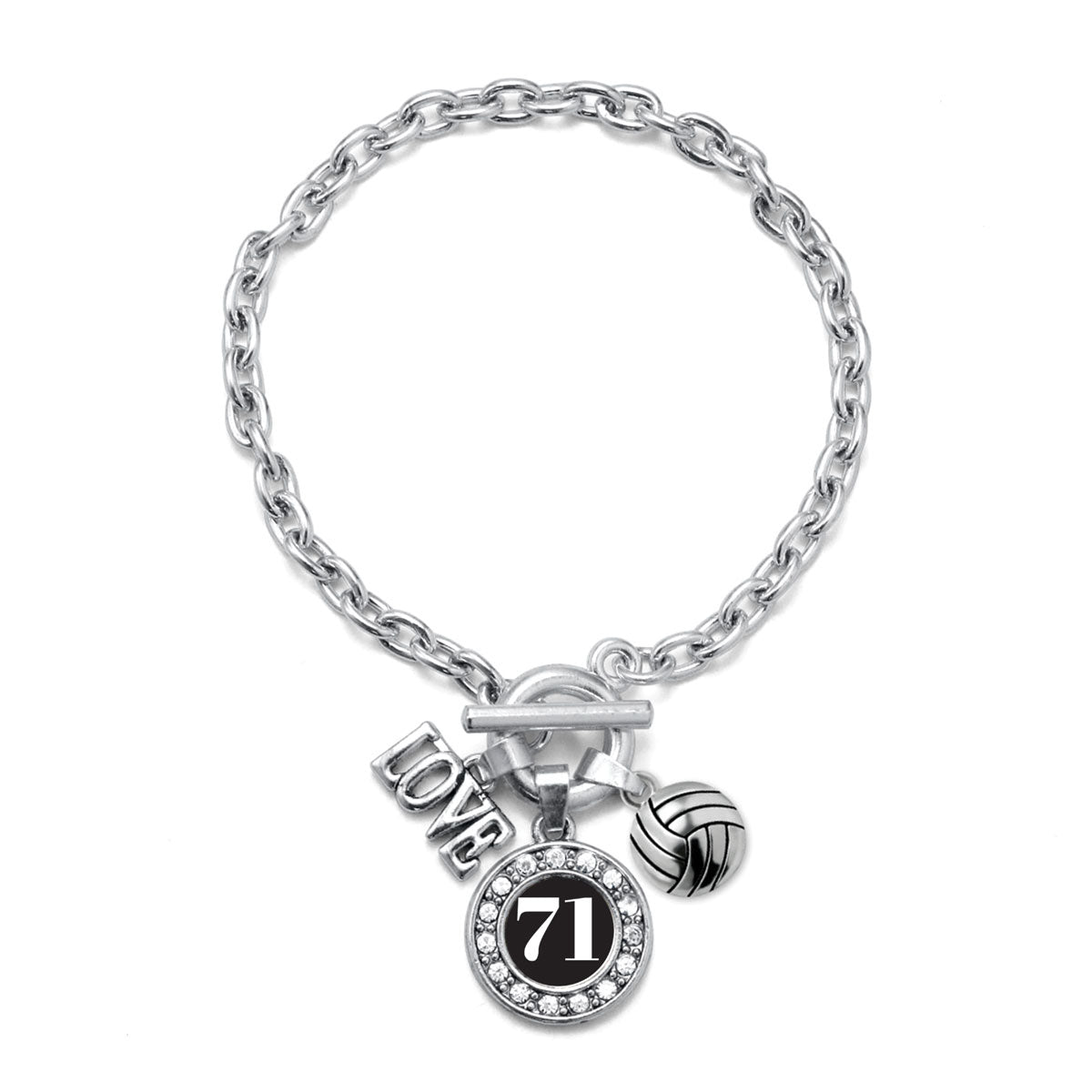 Our sparkling toggle bracelet, equipped with a stylish toggle clasp and the Volleyball - Sports Number 71 circle charm, is crafted from white metal with a silver plated finish and accented with cubic zirconia stones.