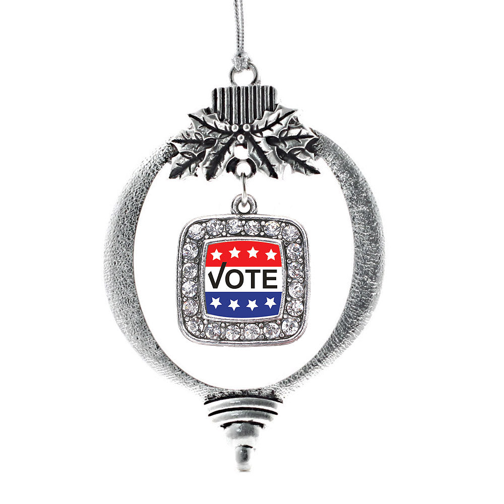 Our sparkling holiday ornament, equipped with a stylish silver rope and the Vote Today square charm, is crafted from white metal with a silver plated finish and accented with cubic zirconia stones.