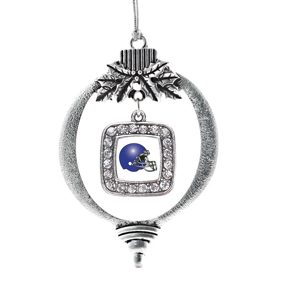 Our sparkling holiday ornament, equipped with a stylish silver rope and the White and Blue Team Helmet square charm, is crafted from white metal with a silver plated finish and accented with cubic zirconia stones.