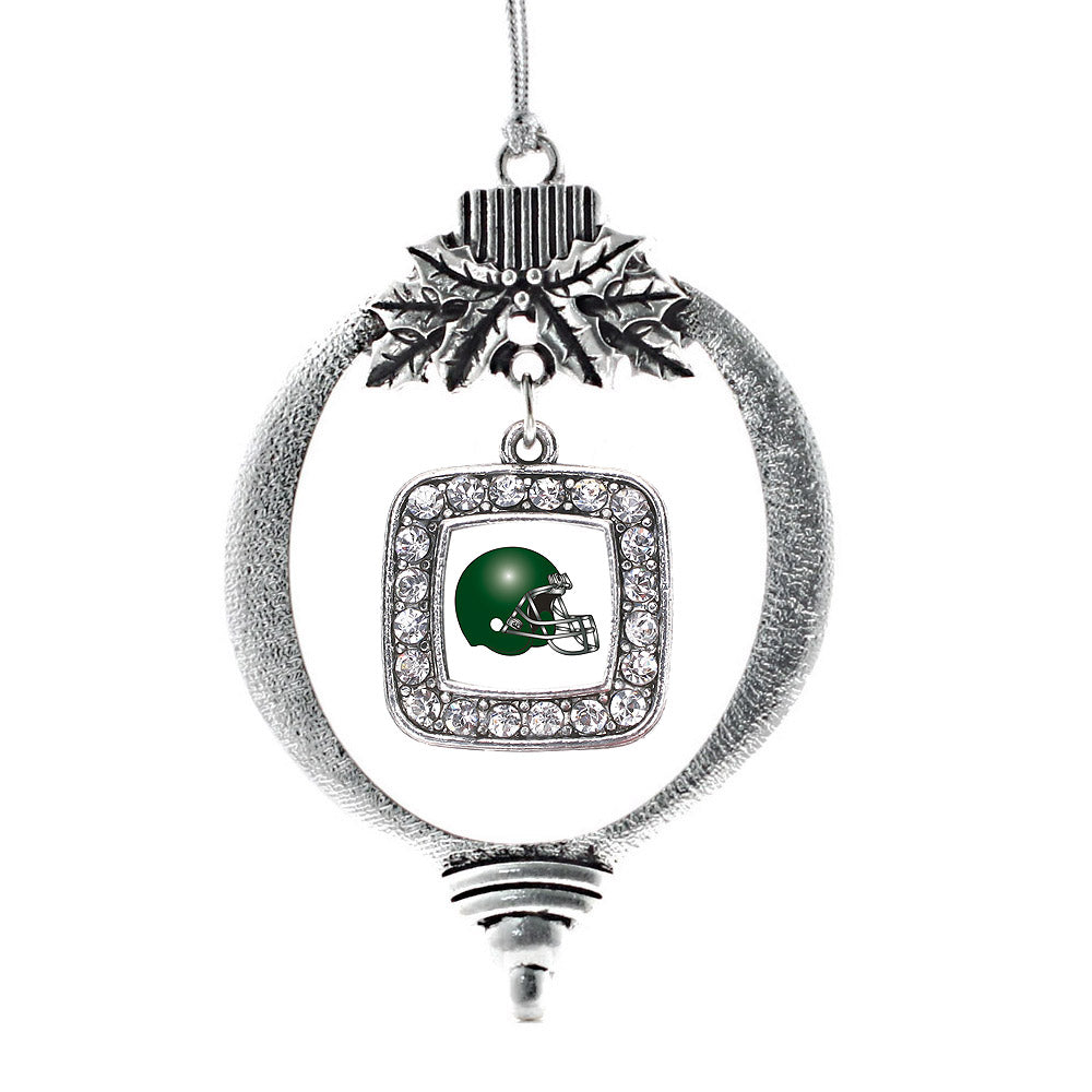 Our sparkling holiday ornament, equipped with a stylish silver rope and the White and Green Team Helmet square charm, is crafted from white metal with a silver plated finish and accented with cubic zirconia stones.