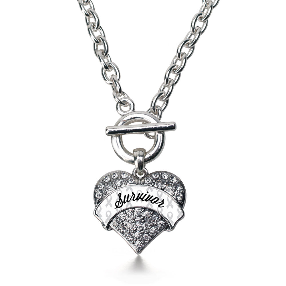 Our sparkling toggle necklace, equipped with a stylish toggle clasp and the White Survivor pave heart charm, is crafted from white metal with a silver plated finish and accented with cubic zirconia stones.
