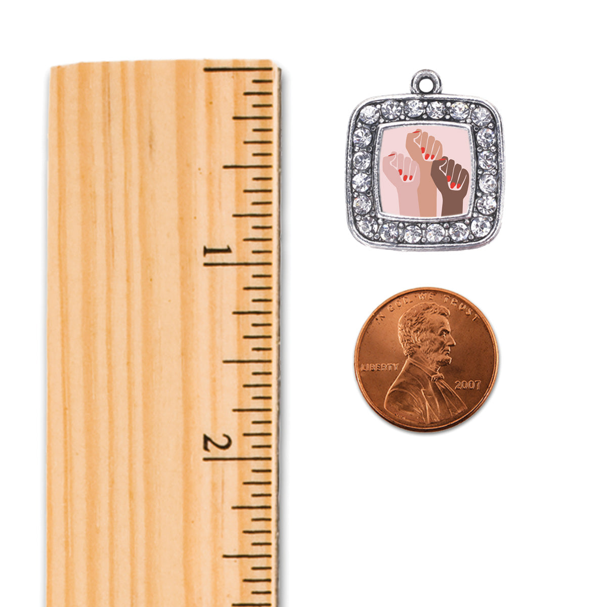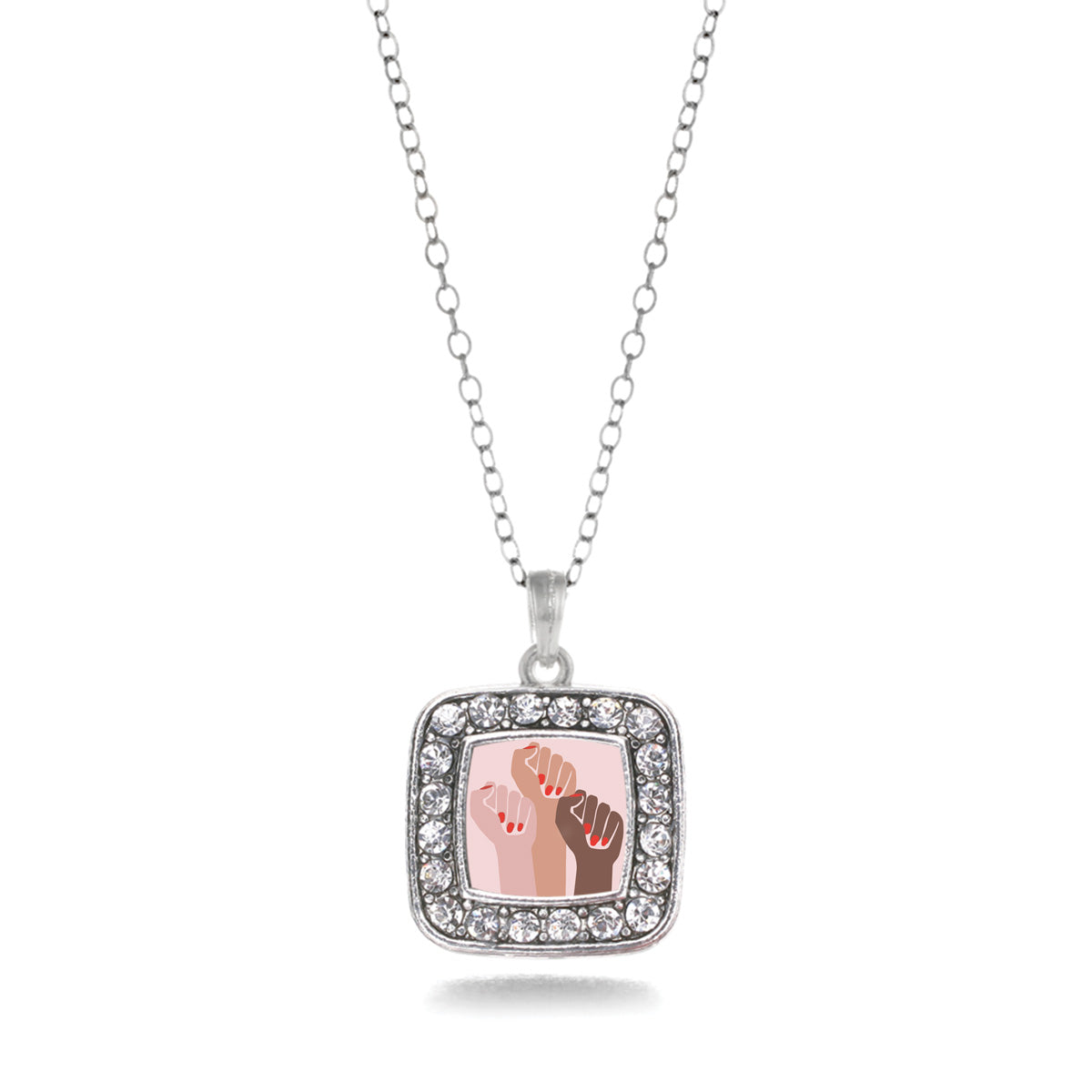 Our sparkling classic necklace, equipped with a stylish lobster claw clasp and the Womens March - Unite! square charm, is crafted from white metal with a silver plated finish and accented with cubic zirconia stones.