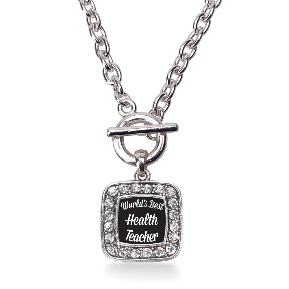 Our sparkling toggle necklace, equipped with a stylish toggle clasp and the World's Best Health Teacher square charm, is crafted from white metal with a silver plated finish and accented with cubic zirconia stones.