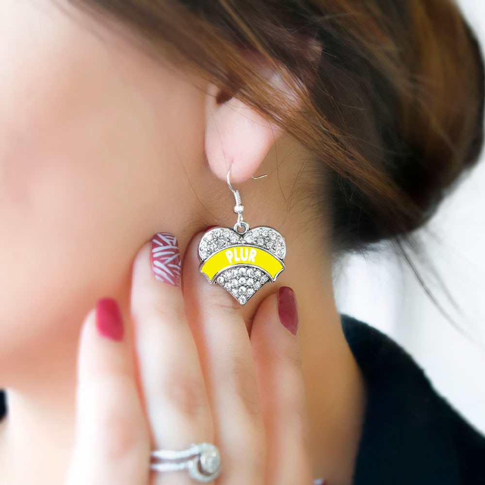 Our sparkling dangle earrings, equipped with a stylish french hook backing and the Yellow PLUR pave heart charm, is crafted from white metal with a silver plated finish and accented with cubic zirconia stones.