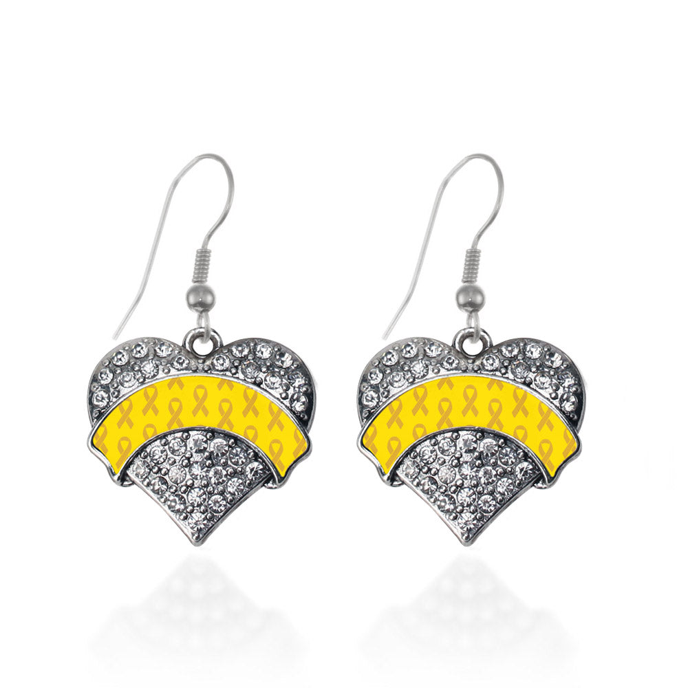 Our sparkling dangle earrings, equipped with a stylish french hook backing and the Yellow Ribbon Support pave heart charm, is crafted from white metal with a silver plated finish and accented with cubic zirconia stones.