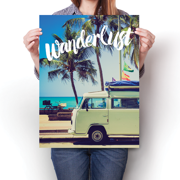 This unique Wanderlust Travel poster was creatively designed and printed on thick paper with a high-quality finish in-house using UV Printing process, where the ink is cured by UV rays to produce sharp and vivid images with a high degree of color accuracy.