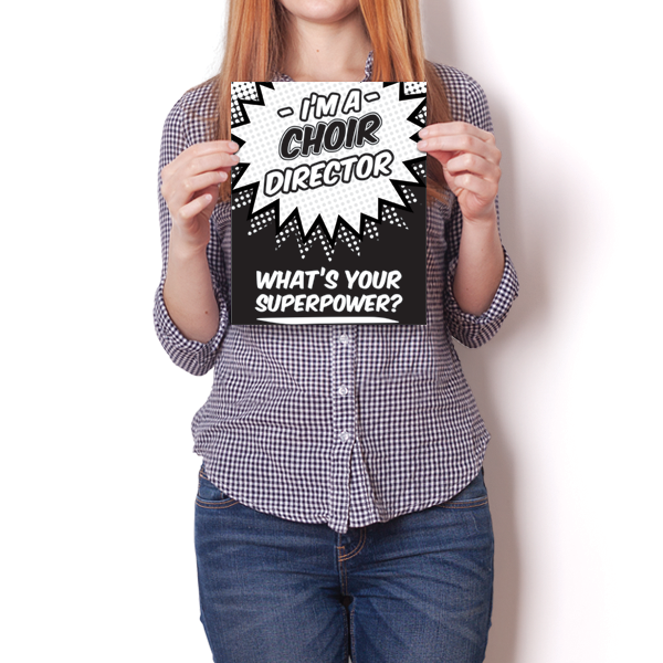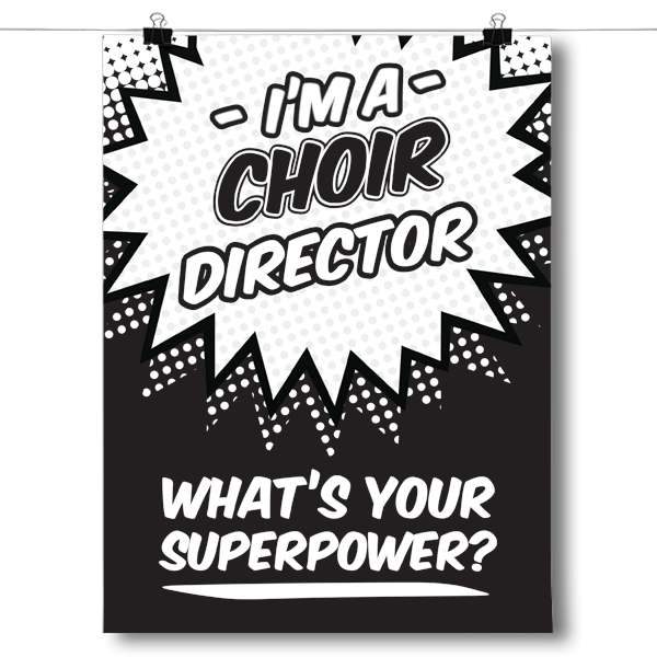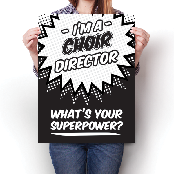 This unique What's Your Superpower - Choir Director poster was creatively designed and printed on thick paper with a high-quality finish in-house using UV Printing process, where the ink is cured by UV rays to produce sharp and vivid images with a high degree of color accuracy.