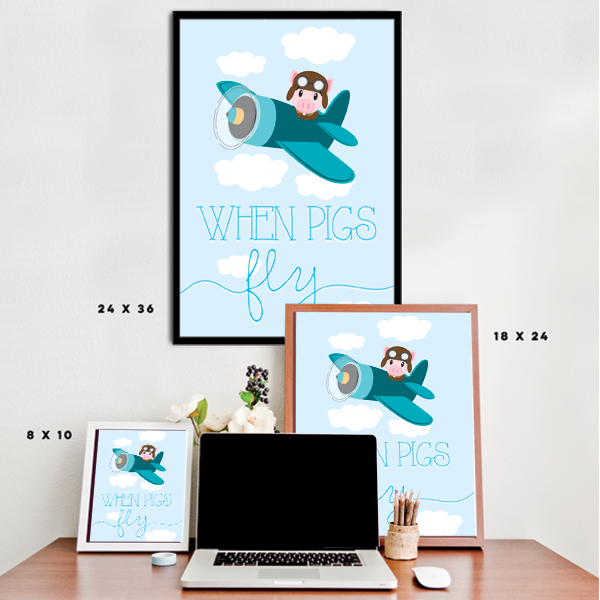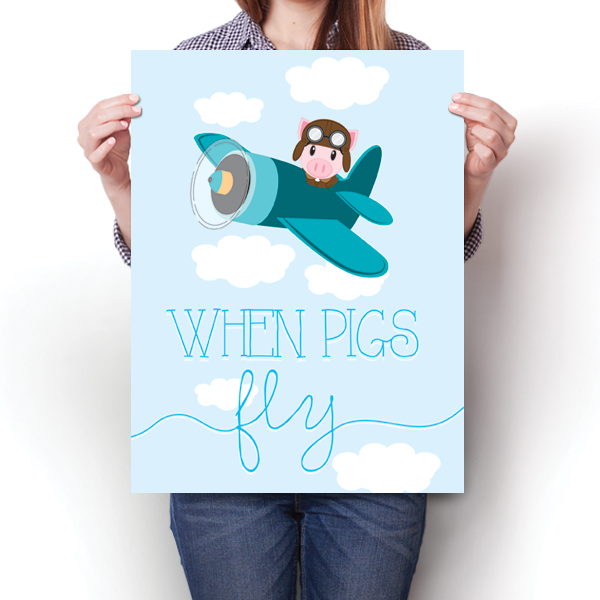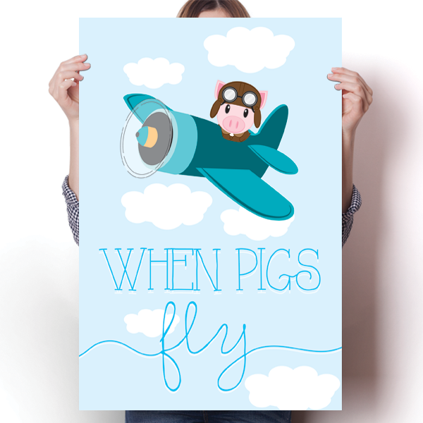 This unique When Pigs Fly poster was creatively designed and printed on thick paper with a high-quality finish in-house using UV Printing process, where the ink is cured by UV rays to produce sharp and vivid images with a high degree of color accuracy.